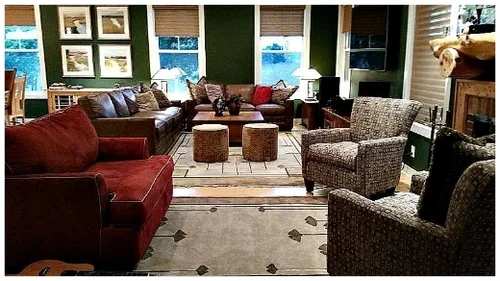 This homeowner loves the out doors, and wanted a comfy casual feeling in the family room. We used pine floors, a large pine mantle, deep spruce walls, and earthy colors and textures throughout.